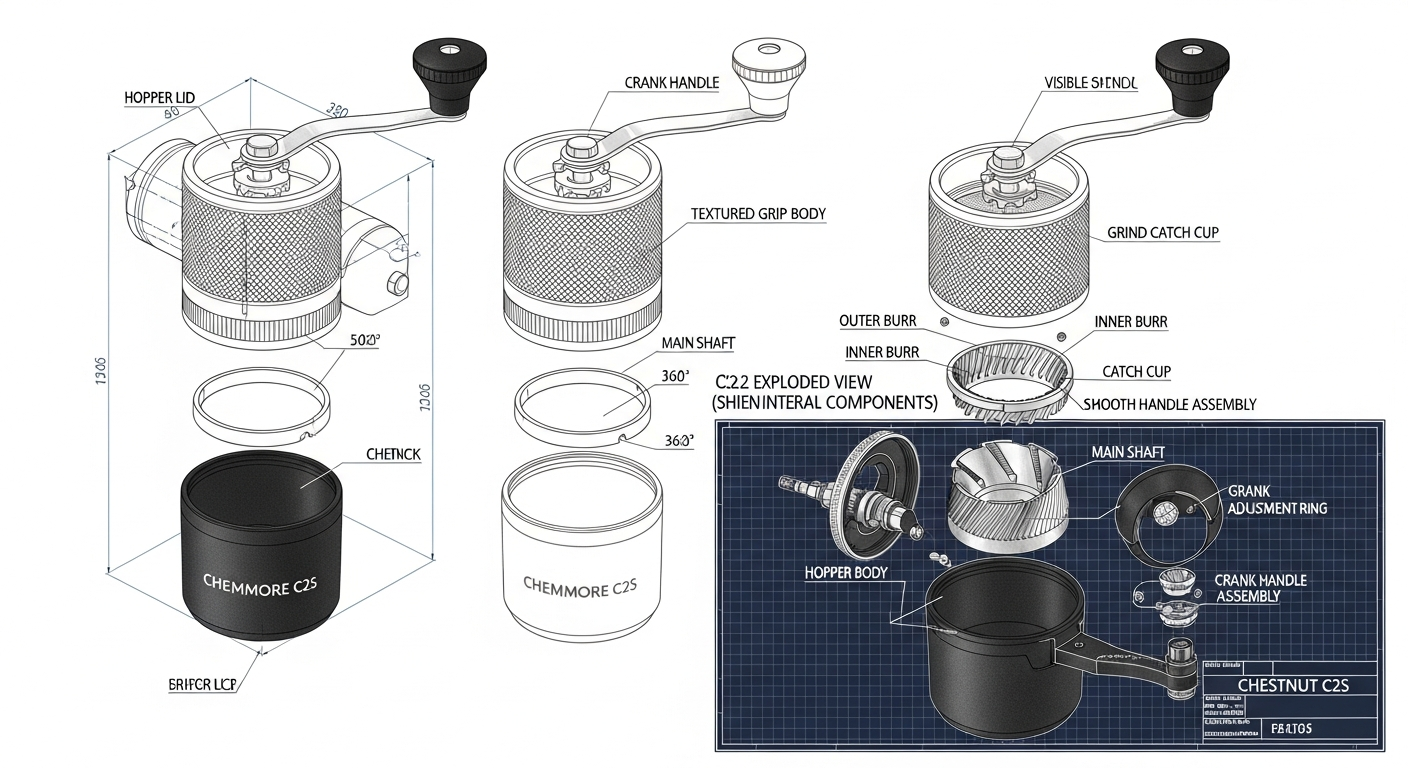 • 粉砕度の均一性向上: 金属製ハンドル・ブラケット、最適化されたベアリングとセンターシャフトにより、軸ブレが抑制され、挽き目の均一性がC2から向上している。これは抽出における「粉砕度」という変数を安定させる上で極めて重要だ。