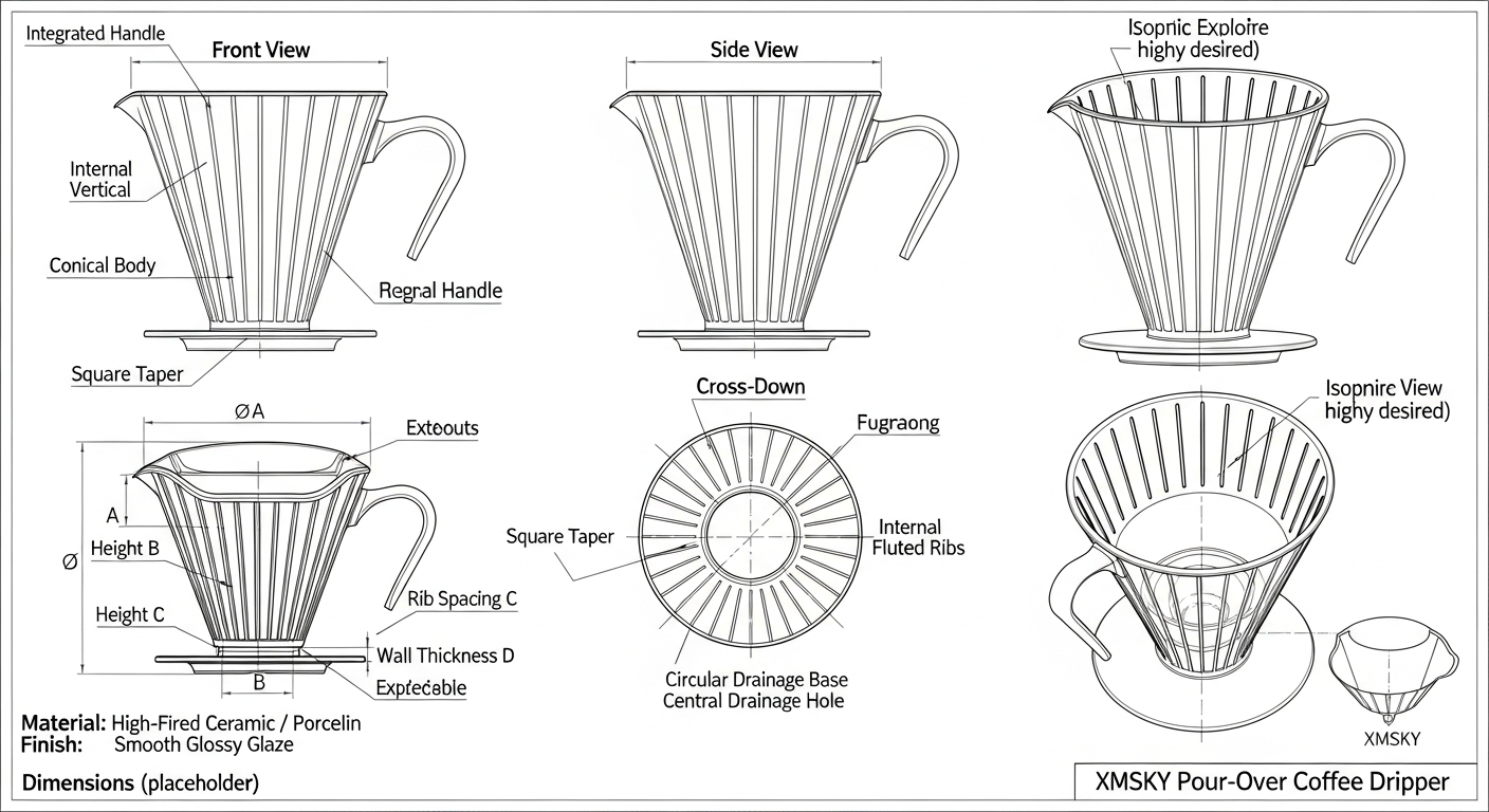 このXMSKYポアオーバーコーヒードリッパーは、セラミック製のV字型(円錐形)ドリッパーである。メーカーは「最高品質」のセラミック素材と「革新的な3穴ドリッピングデザイン」により、優れた保温性と最適な抽出を謳っている。その設計思想は、手軽に「最適な抽出時間」と「口当たり」を実現することにあると解釈できる。しかし、私が注目するのは、この「革新的な」と称される部分が、果たして抽出の変数を固定する助けとなるか否かだ。